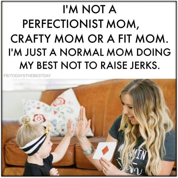 11. A mom who keeps trying. A mom who says she is sorry when she needs to. A mom who is not a doormat to her kids or anyone else. A mom who is teaching her kids how to operate in the world and she doesn’t want them being treated or treating other badly. She works to teach them to be decent by insisting they be decent to each other and to her. A mom who gives herself credit for what she’s doing right and knows where she needs to improve and is working on it.